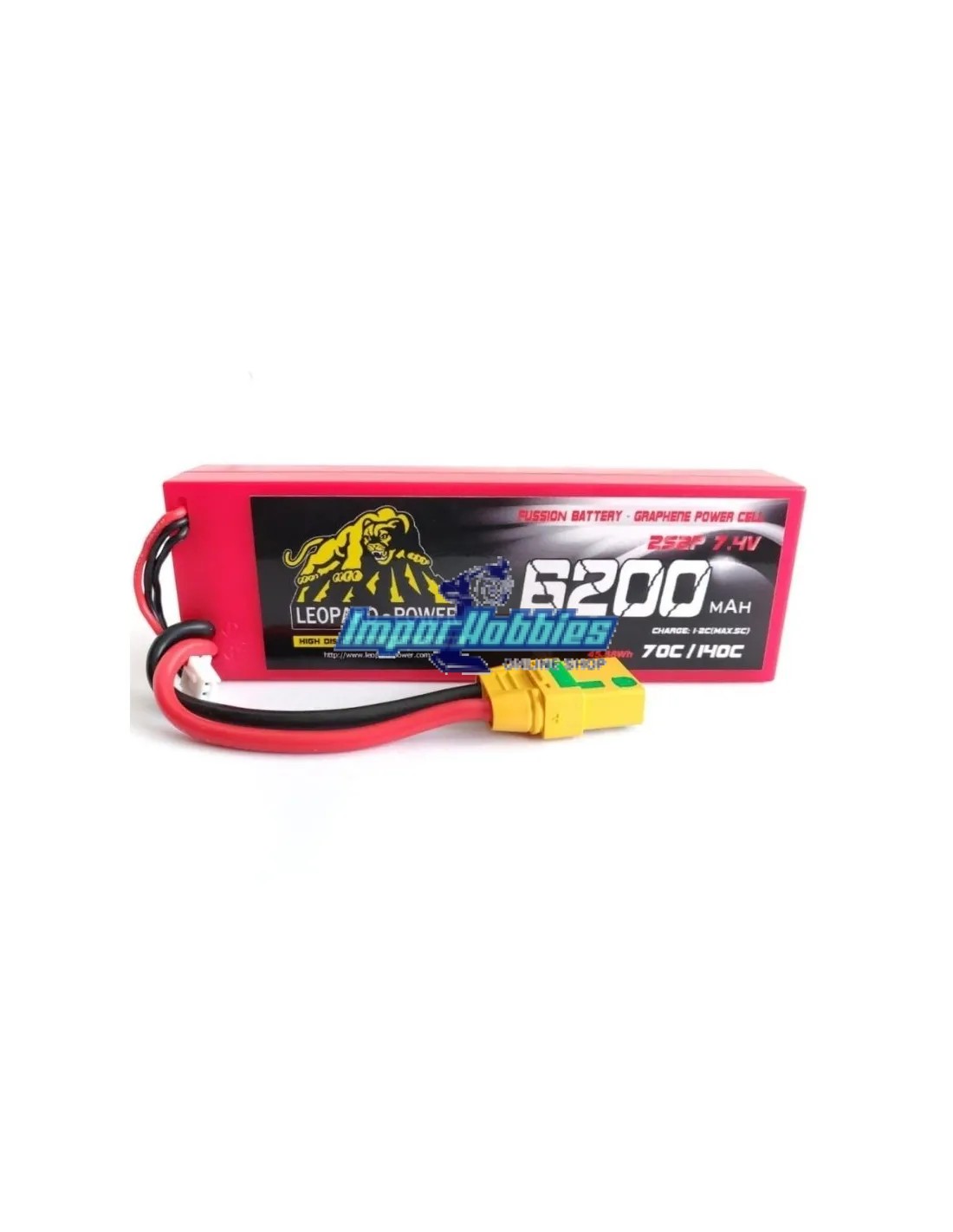 Spécifications: Modèle de batterie: LPG-FS2-6200 Type: LIPO Stick Pack Capacité: 6200Mah Tension: 7.4V Type de connecteur: Amass XT90-S Anti-Spark (Compatible avec les connecteurs standard) Connecteur equilibrage: XH Nombre de cellules: 2 cellules Configuration: 2S Décharge continue: 70C Courant de décharge maximal (10 sec): 140C Taux de charge: 1-2C (max. 5C)